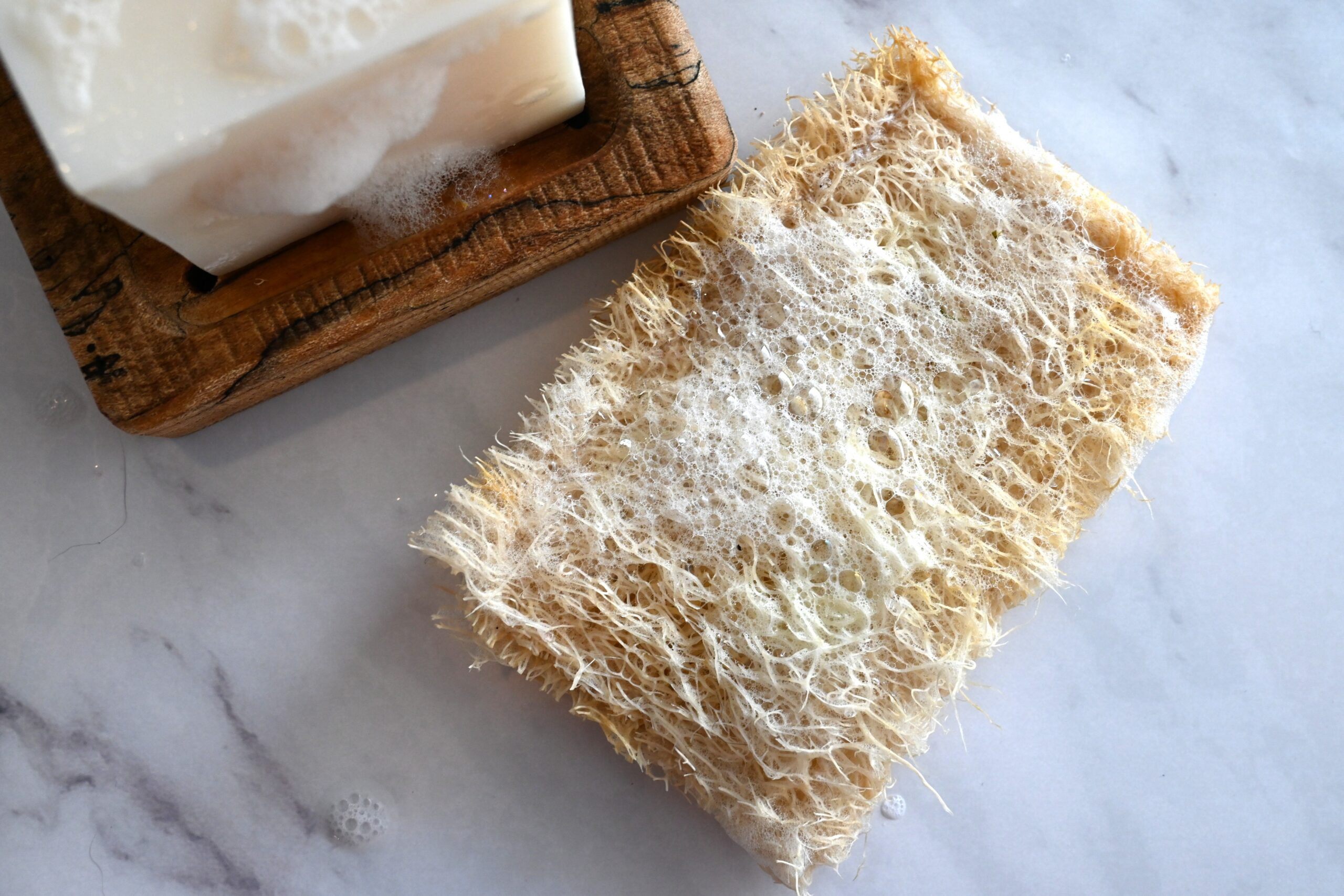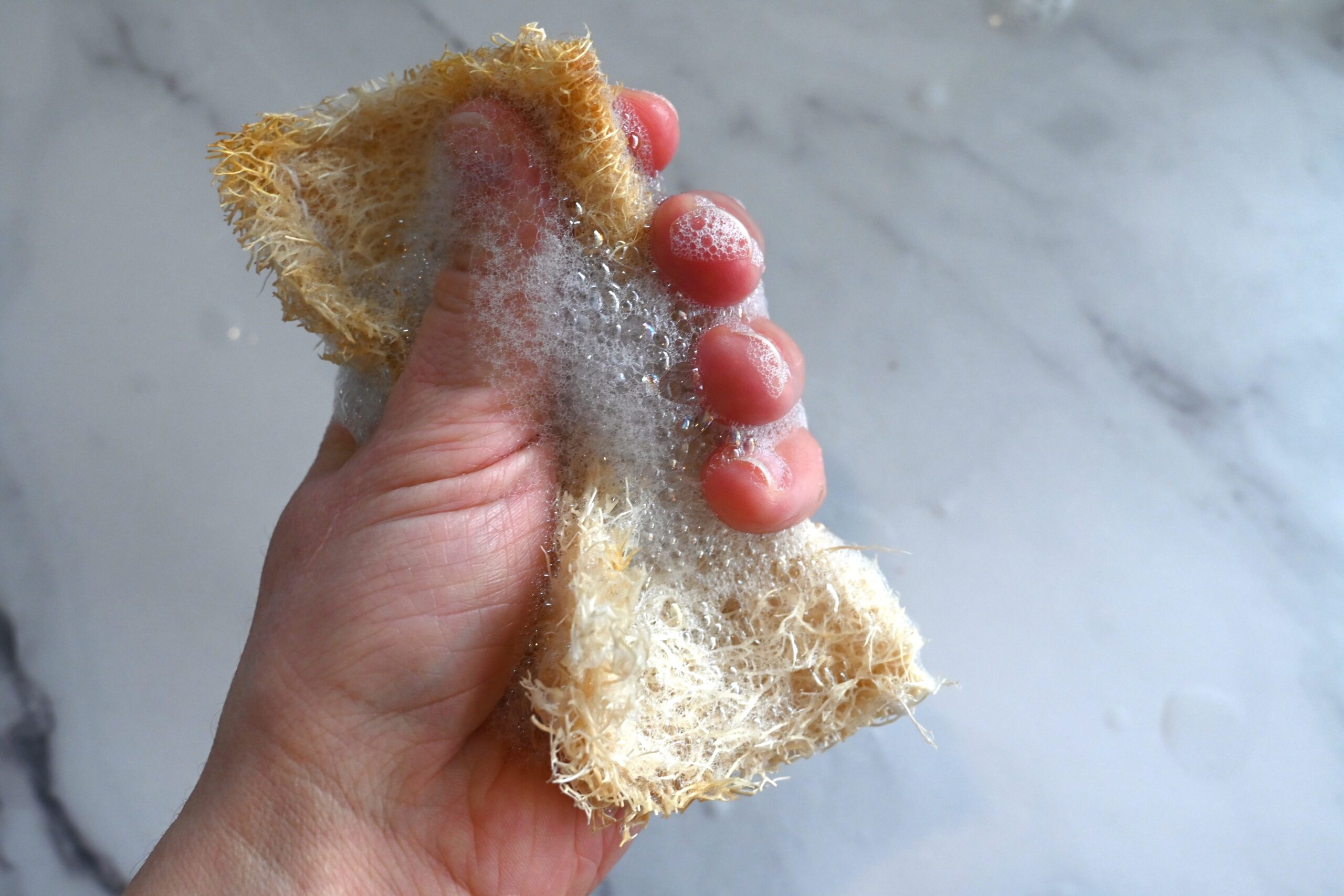 Before scrubbing, fully wet the loofah so it becomes pliable. Add a few drops of dish soap or scrub it on our natural dish bar. Squeeze it a few times to create a light lather. Proceed to scrub dishes. When done, squeeze water from the sponge and hang to dry.